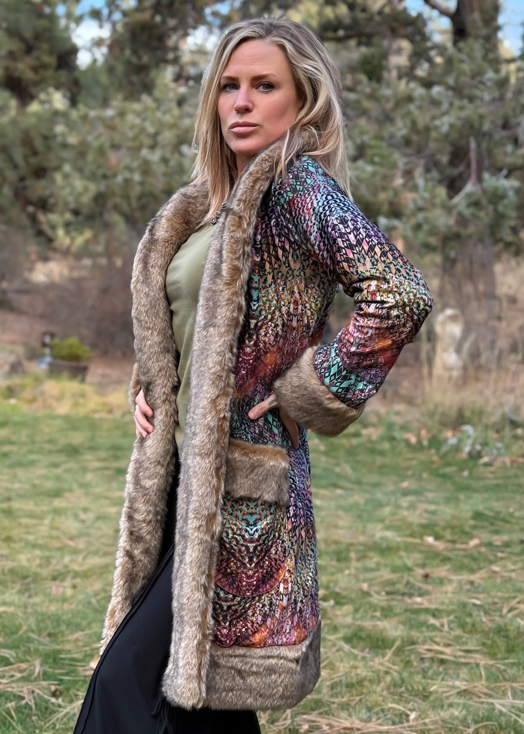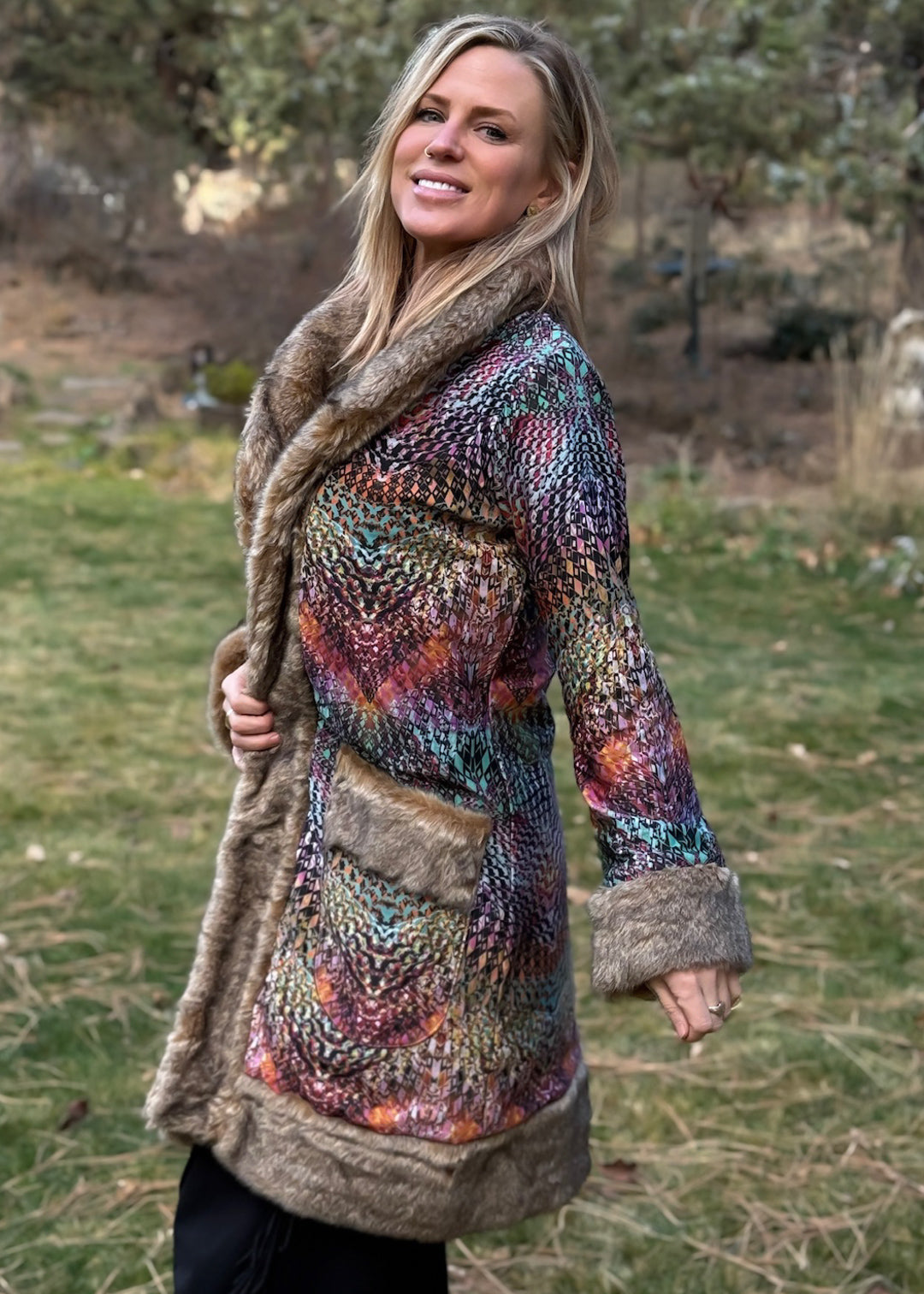 Let your soul shine... Reflect the beauty of your self and your surroundings with this colorful, all-purpose party coat!  It's cozy, warm, and well-appointed with deep pockets (and secret pockets) for all of your stuff & things.  Straps inside that allow you to sling it off and wear it like a cape, when the dancing gets you all warmed up!  Believe us, it's the Ultimate Festival Coat (a.k.a. UFC)!
