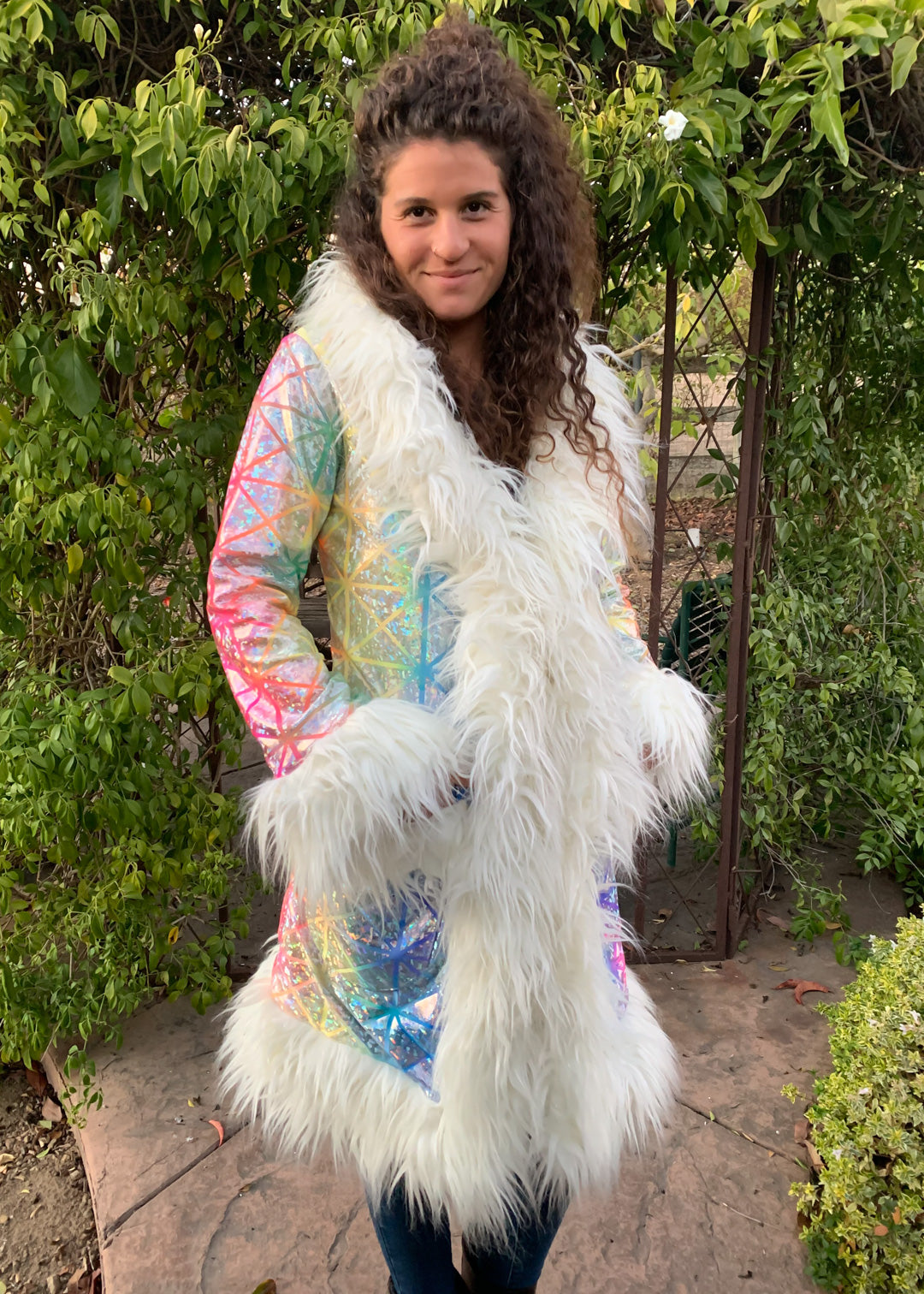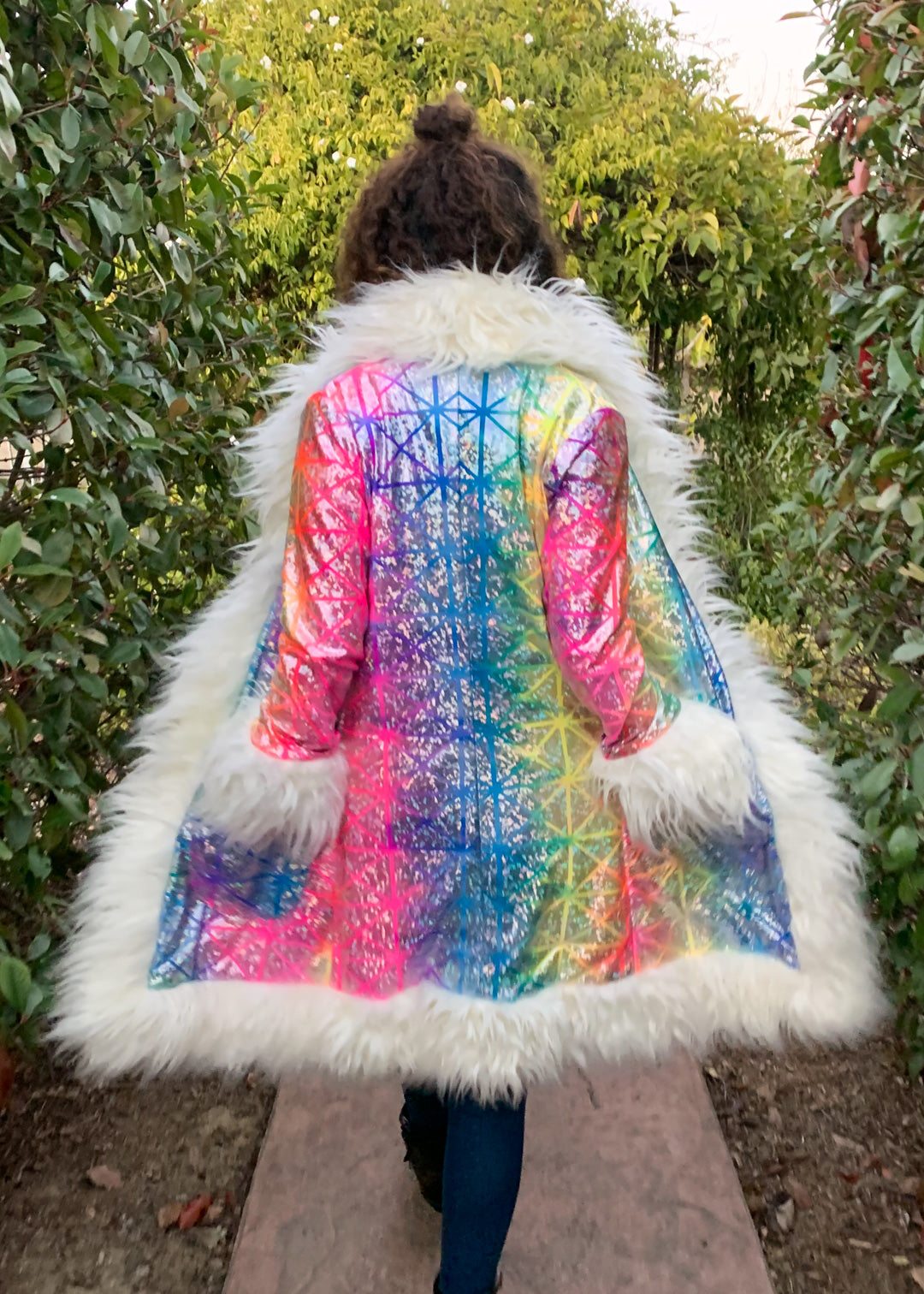 Let your soul shine... radiate the beauty of your self and your surroundings with this colorful, all-purpose party coat!  It's cozy, warm, and well-appointed with deep pockets (and secret pockets) for all of your stuff & things.  Straps inside that allow you to sling it off and wear it like a cape, when the dancing gets you all warmed up!  Believe us, it's the Ultimate Festival Coat (a.k.a. UFC)!