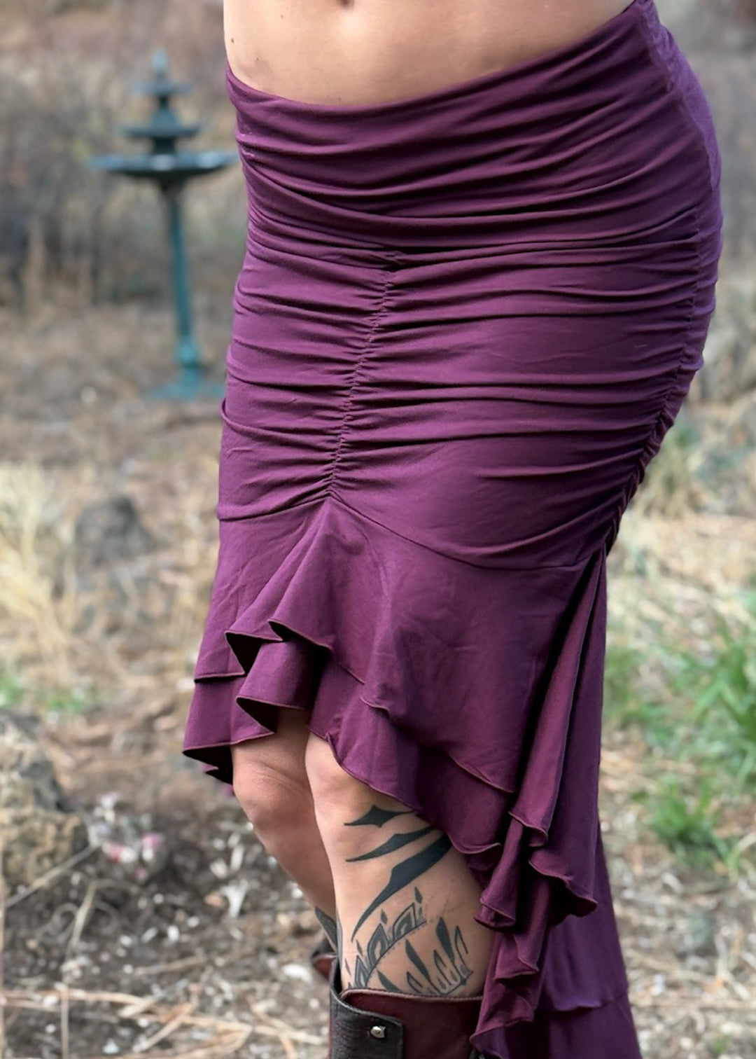 Harness your inner mermaid with this versatile skirt, made with a lusciously soft and slinky rayon/lycra blend. Wear it short in the front and long in the back, or twist it 90 degrees so that the ruffles cascade asymmetrically across the front of your legs! We've even seen ladies rock this garment pulled up over the torso as a strapless bando top. The possibilities are endless. Adorable in summer with sandals, or in the winter, with boots and even leggings underneath.